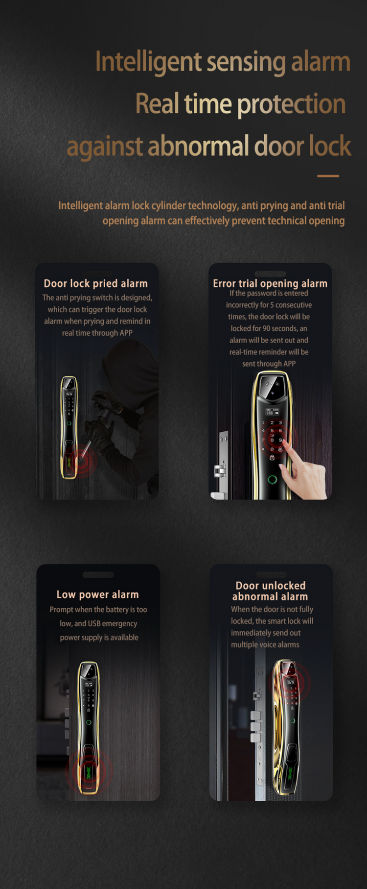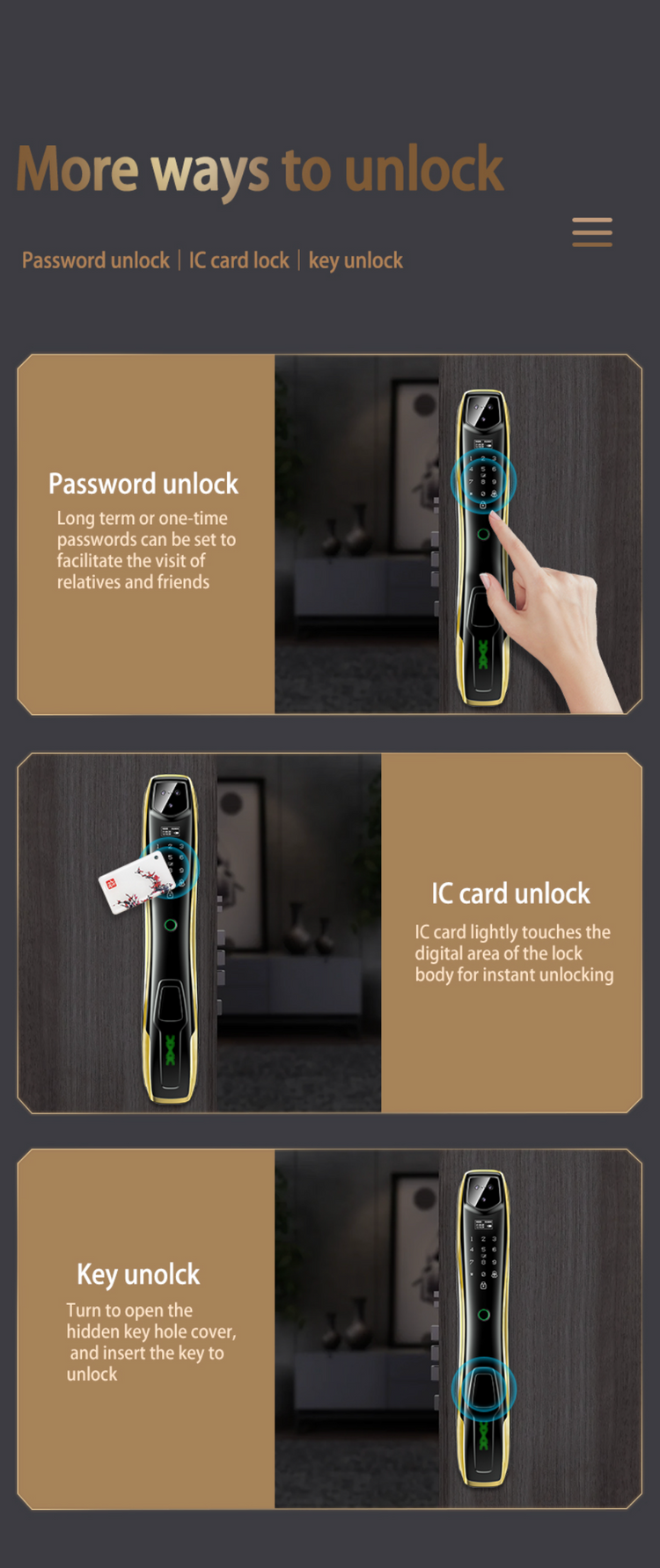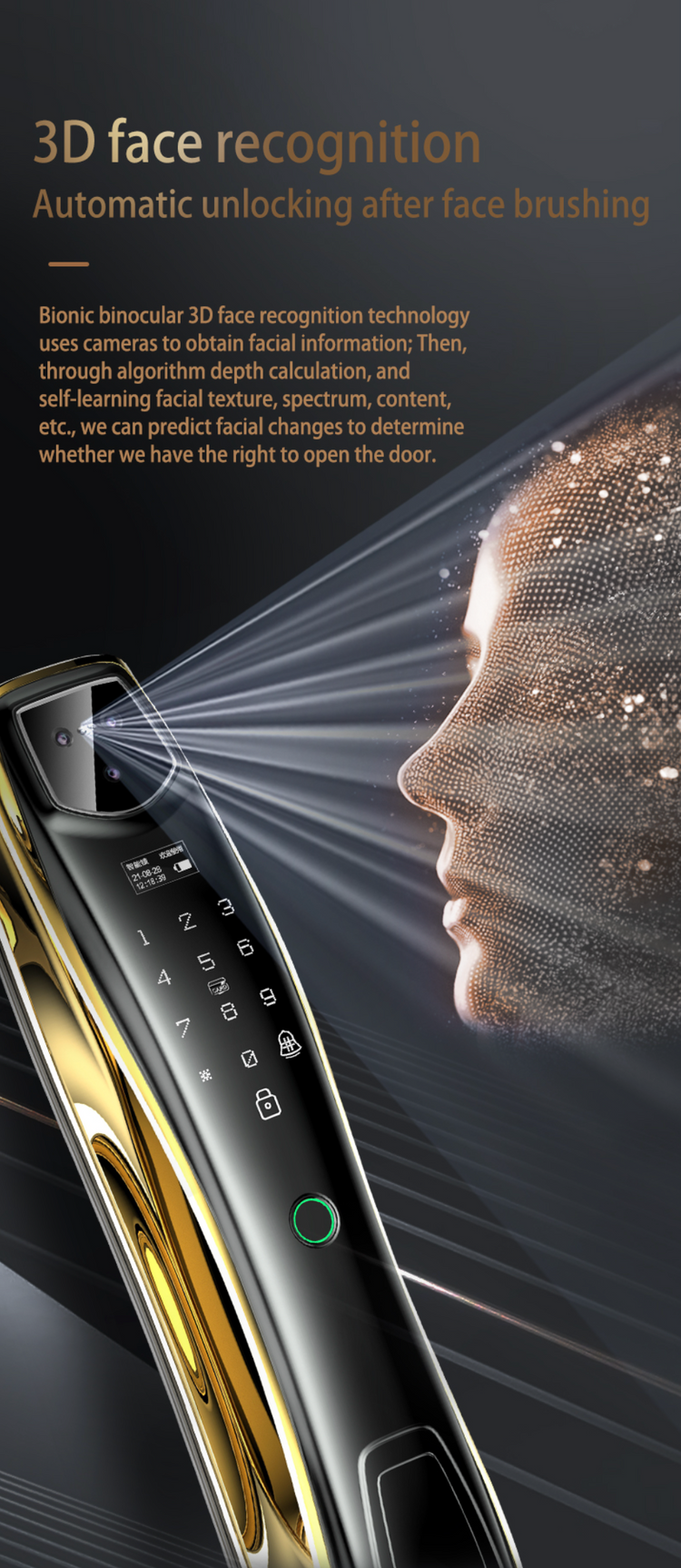 - Unlock mode: Face+Password+Fingerprint + Key+Card